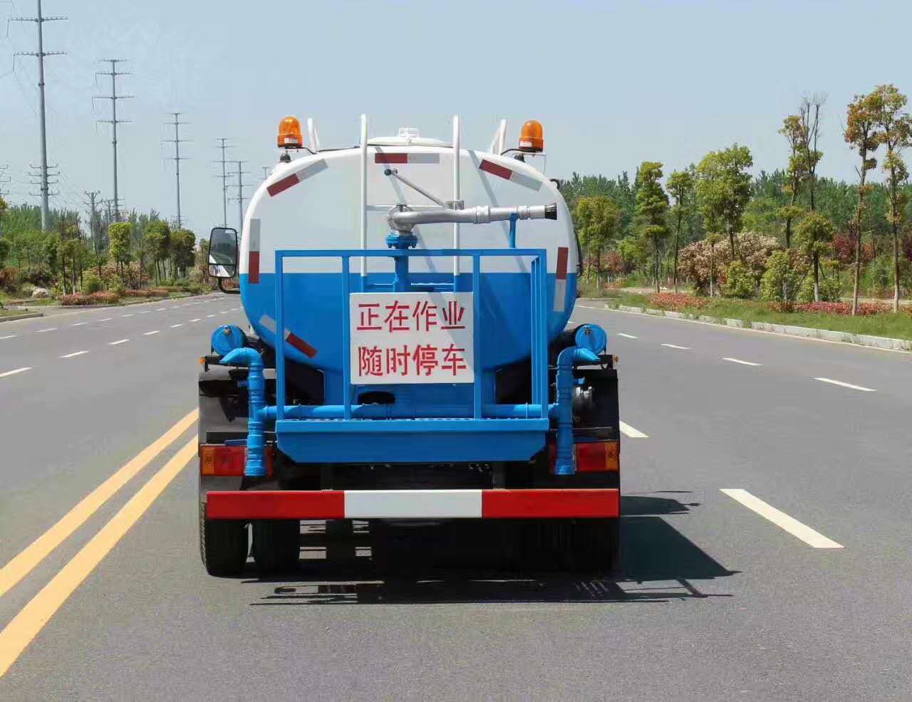 改裝配置:罐體用4MM碳鋼板制作,罐內隔板具有防波作用,以減低汽車行駛時罐體液體的沖擊。整車帶一個專用灑水泵(垂直最大吸程6米),灑水寬度14米,射程28米。多功能灑水車配備2個前沖(噴)(能將路面泥巴、塵土、垃圾沖干凈);2個后灑(能均勻地將水灑在路面,一次灑水寬度14米)、2個側噴(花灑)(能均勻地將路旁綠化帶澆灌)、帶1個后工作平臺,平臺上安裝1個綠化灑水高炮(灑水炮可全方位旋轉,可連續調成直沖狀、大雨、小雨、毛毛雨,霧狀可調節沖洗高大樹木),引水時間<5min,流量90m3/h。帶1個消防接頭,帶1個自流閥,1個過濾裝置、人性化爬梯及側防護欄,安裝灑水音樂喇叭。