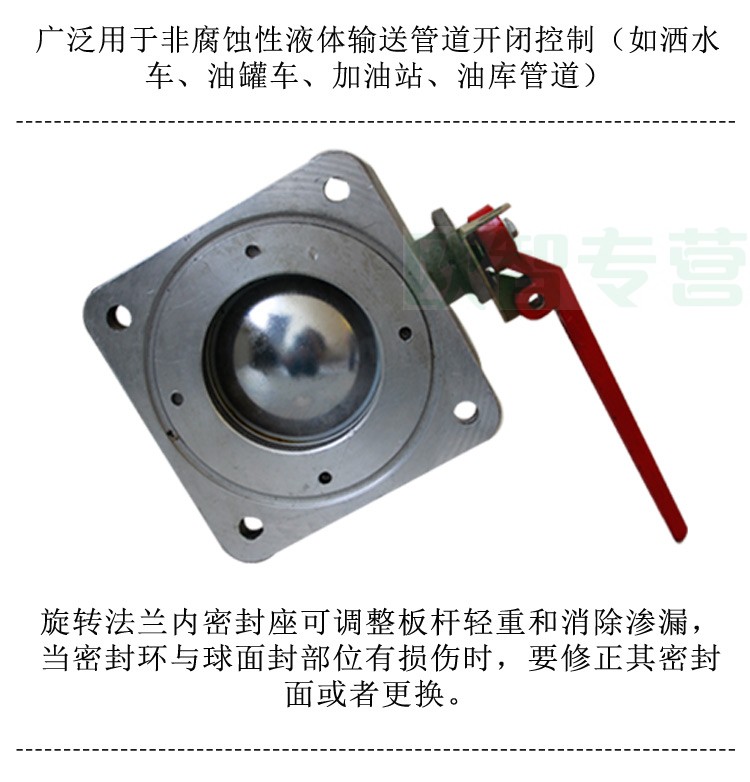 綠化灑水車配件-直通球閥 直通球閥又稱二通球閥,方法蘭,鋁合金產(chǎn)品,防腐防銹。直通球閥用途:廣泛使用在灑水車,油罐車,化工車,消防車等專用汽車上直通球閥型號:DN50,DN65,DN80,DN100。直通球閥特點:球閥采用鋁合金殼體,不銹鋼球芯,具有材料配制合理結(jié)構(gòu)緊湊,重量輕,體積小,使用方便等優(yōu)點,設(shè)有限位和加鎖裝置,安全可靠。直通球閥調(diào)整:旋轉(zhuǎn)法蘭內(nèi)密封座可調(diào)整板桿輕重和消除滲漏,當(dāng)密封環(huán)與球面封部位有損傷時,要修正其密封面或者更換。
