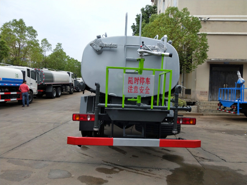 灑水車標配::前沖(噴),后灑,帶側噴(側花灑),后置工作平臺,平臺上安裝高壓炮(炮噴射形狀可調成直沖狀、大雨、中雨、毛毛雨、炮可360度旋轉,射程>30米)。帶自流閥,消防接口。帶自吸泵,可將池塘的水直接吸入罐體內也可直接從城市街道消防栓上連接注水,吸入罐體內。罐前量管(觀察罐內水位)、罐后爬梯、罐上罐口帶簡易護欄、罐側雙炮筒,罐體表面雙層油漆工藝,防銹、耐腐蝕