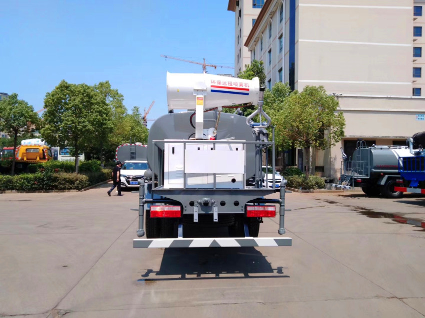 灑水車整車具有前沖、后灑、側噴(更換噴頭后變為側花灑)、后置式工作平臺(帶踏梯,四周有安全護欄)、平臺上設置有高壓水炮(可360°旋轉,水流可調成柱狀,射程≥28米;也可調成霧狀,射程≥14米,可連續噴射出:直沖狀、大雨、中雨、小雨、毛毛雨)。該車灑水寬度大于14米,配備優質大功率專用灑水泵(可自吸自排,垂直吸程6.5米)、取力器、雜物過濾網、國標通用65型消防接口(可通過消防栓加水)、1套自流球閥系統、2根引水鋼絲膠管(帶陰陽快速接頭)、配鎖、水位計、高音作業喇叭,兩側及后加強型保險杠,防滑爬梯,膠管儲存筒。