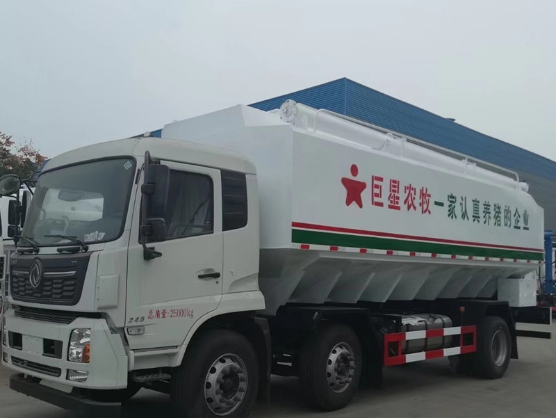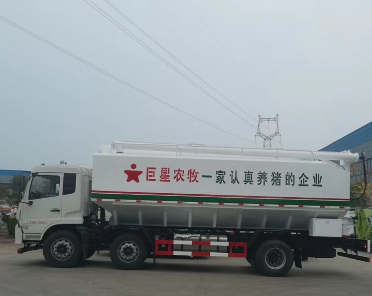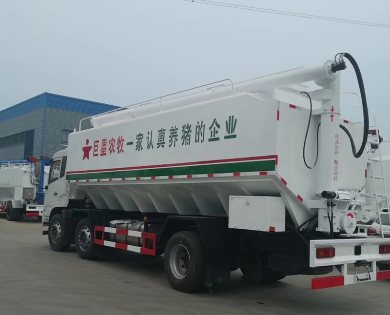 國六東風天錦小三軸散裝飼料運輸車-30方散裝飼料車:東風天錦VR駕駛室,康明斯245馬力發動機,法士特8檔變速箱,1800+5000mm/1800+4100mm軸距,11.00R20鋼絲胎,電動門窗,中控鎖,原廠空調,ABS,方向助力,鋁合金擋泥板,帶環保和燃油,上戶辦營運證無憂!上裝采用武鋼優質碳鋼板,三條絞龍,頂部絞龍可180度旋轉,分設四個倉,可獨立控制各個倉的卸料順序和速度!