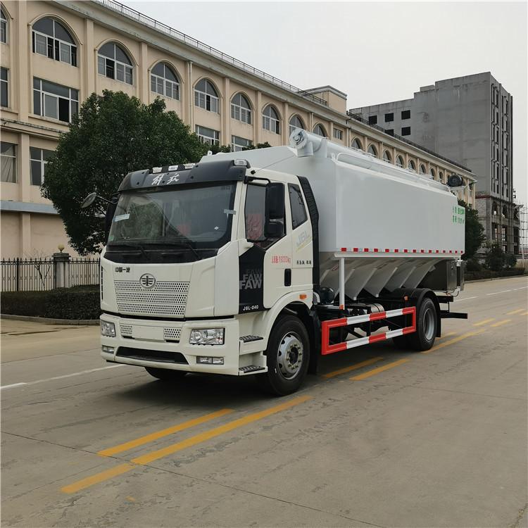 放J6散裝飼料運輸車|解放20方散裝飼料車底盤配置:采用解放J6系列排半駕駛室底盤,大柴180馬力發動機,6檔變速箱,280雙層大梁,前橋4.5噸,后橋9噸(加強型前后鋼板彈簧),10.00R20鋼絲胎,斷氣剎,排氣制