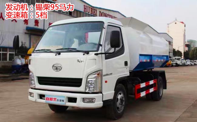 解放霸鈴掛桶式垃圾車,解放霸鈴1700單排駕駛室,錫柴490發動機、95馬力,臨工5檔變速箱,6.00-15輪胎,單層局部加強大梁,帶動力轉向,電熄火,24V電瓶,電調收音機,MP3,帶有ABS,斷氣剎。