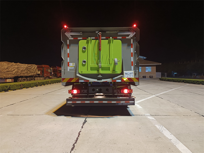 垃圾箱容積7方碳鋼電泳,清水箱容積9方碳鋼電泳,帶2個中置掃盤,;三洋馬達;高壓水泵(前沖/側噴/中噴/后噴霧/沖洗水槍/垃圾箱自潔裝置);高壓路沿清洗噴頭,低壓泵(前沖);控制器;控制箱;PLC一鍵控制:尾部LED箭頭燈;垃圾箱、水箱均帶防溢低水位報警裝置;倒車及洗掃狀態室內監視器。20m高壓沖洗卷盤。