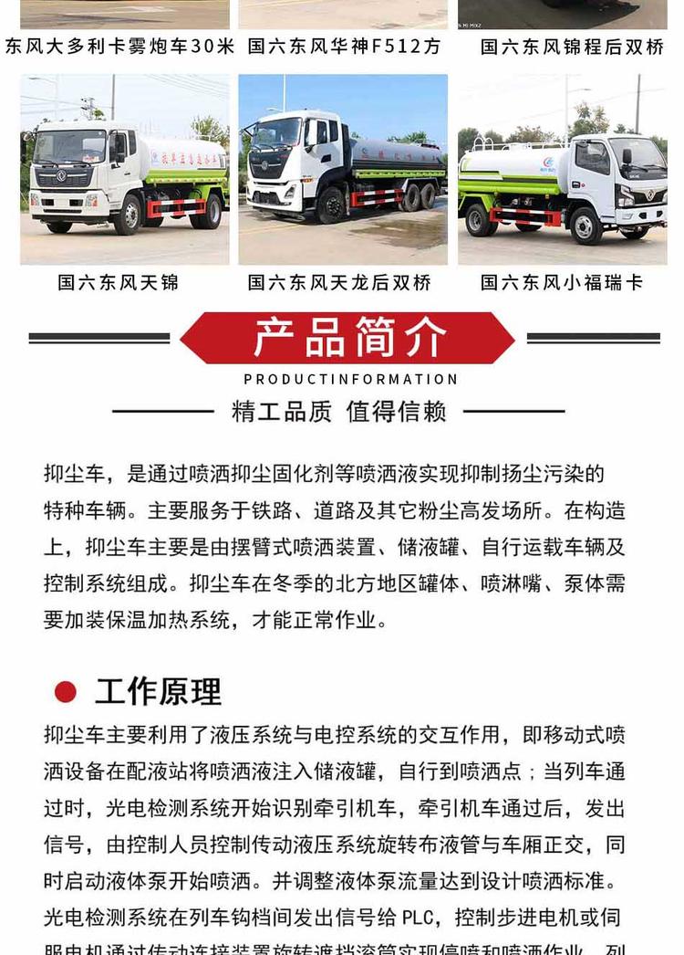 灑水車性能簡介:吸程≧7米,灑水寬度≧14-16米,射程≧25-40米,引水時間<5min,流量60m3/h。前沖(噴)、后灑、帶側噴(花灑)、帶后工作平臺、平臺上安裝綠化灑水高炮(炮噴射形狀可調節:直沖、大雨、中雨、毛毛雨、霧狀、可連續調節,360°旋轉),配消防接口,自流閥,濾網,帶自吸自排功能。