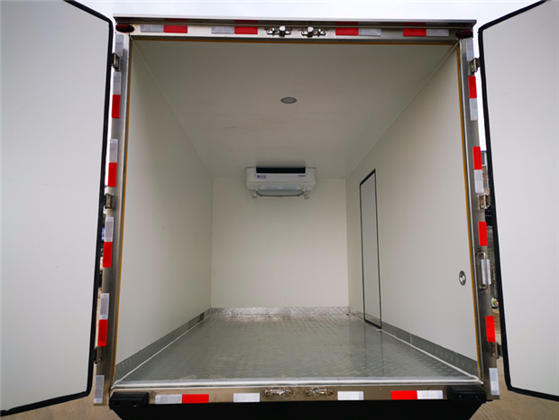 福田奧鈴3米7冷藏車廂體配置為:采用斷橋隔熱工藝,整體框架結構制作,廂體內、外壁材料為玻璃鋼板,采用高密度保溫層,廂板內帶有骨架,廂體厚度80mm,門框,門飾件、包角全部使用不銹鋼材質。最新款鋁合金包邊型材,廂體內采用LED照明燈及廂體示寬燈;門框密封條為橡膠材質,后門梁帶加厚防撞塊,加厚型不銹鋼鉸鏈及鎖件。車體副梁采用510L高強度鋼制作,底板為鋁花紋板,車廂后門帶一個上車扶手,其余標配;