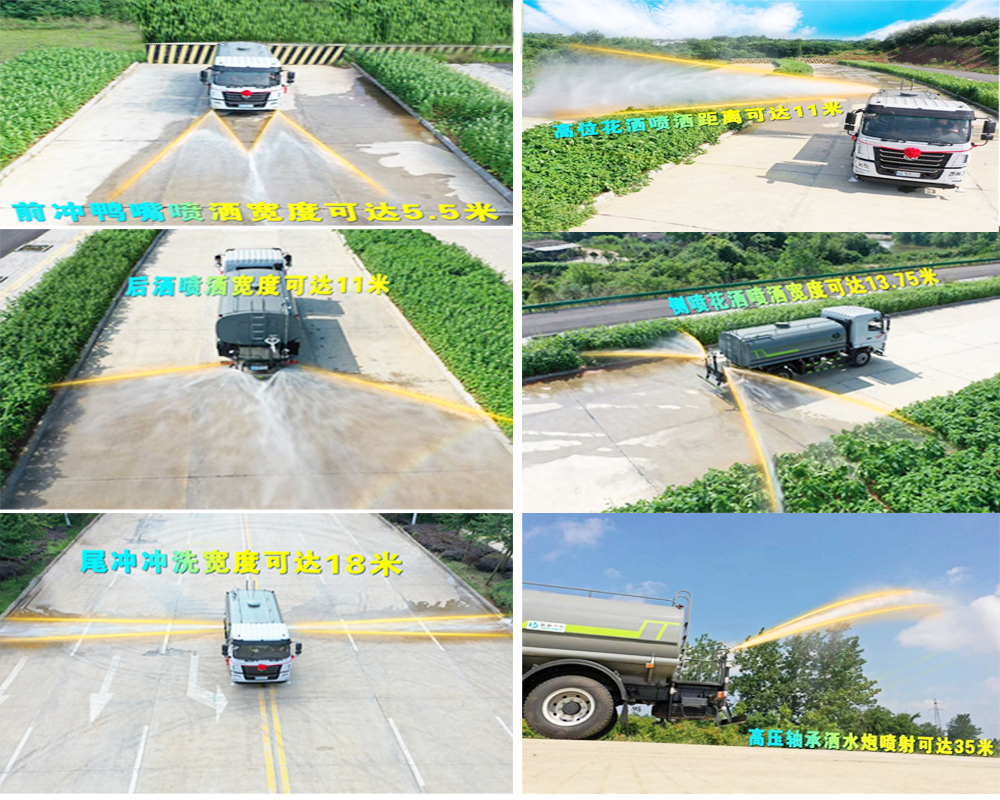 罐體實際容積約為9.35立方米,采用武鋼優質碳鋼板卷壓成型。配備專用灑水泵,自吸自排,前噴后灑、側噴、后工作平臺及灑水高壓炮。灑水泵自吸高度為6米左右,整車灑水寬度14米左右,后工作平臺水炮可調成:直沖狀、大雨、中雨、小雨、霧狀,有效射程≥28米,整車帶接頭、水位計,自流閥。后工作平臺主管道有一個一寸的澆花接口,附送2根3米水管,1個爬梯,兩側及后保險杠。
