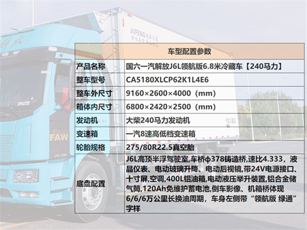 解放J6L 6米8冷藏車車身配置為:J6L精英版全浮高頂排半駕駛室,顏色為粉綠色(可選紅色,白色),液晶儀表、電動(dòng)玻璃升降、電動(dòng)后視鏡、側(cè)圍網(wǎng)兜、后圍窗簾導(dǎo)軌、全景窗簾導(dǎo)軌、頭頂放物盒、駕駛員座椅為真皮通風(fēng)空氣座椅(腰托、扶手)、中間座椅、帶24V電源接口、十寸屏、多功能大角度方向盤 自動(dòng)空調(diào)、前下防護(hù)裝置、400L鋁油箱、一體式金屬寬體保險(xiǎn)杠、駕駛室四點(diǎn)螺簧懸置、電動(dòng)液壓舉升裝置、鋁合金儲(chǔ)氣筒、120AH免維護(hù)蓄電池、LED轉(zhuǎn)向燈、霧燈帶輔助遠(yuǎn)光、懸架7/7+3、水壺座、定速巡航、VOSS管路及接頭、機(jī)箱橋體現(xiàn)6/6/6萬公里長(zhǎng)換油周期、右轉(zhuǎn)彎音響提示、限速89km/h、T-box1.5、安全帶佩戴提醒、制動(dòng)器襯片更換報(bào)警、金色鷹標(biāo)、車身左側(cè)帶“精英版”字樣、排氣節(jié)流閥,大柴CA6DH1-24E6,240馬力發(fā)動(dòng)機(jī),(EGR+DOC+DPF+SCR氣驅(qū)),ф395離合器,變速箱CA8TAX090M變速器,車橋ф378鑄造橋(自動(dòng)調(diào)整臂、國(guó)產(chǎn)ABS、1860輪距) 9T橋,4.333,車架:237×75×6.5,275/80R22.5型18層級(jí)無內(nèi)胎(土樓輪輞、國(guó)內(nèi)一線品牌)。
